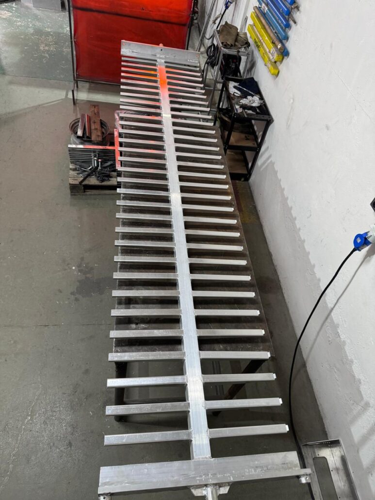 A esteira rolante, fabricada em alumínio com parede de 4 mm, foi montada e soldada conforme as especificações técnicas do projeto, assegurando alinhamento, resistência estrutural e funcionamento adequado dentro da linha de produção.